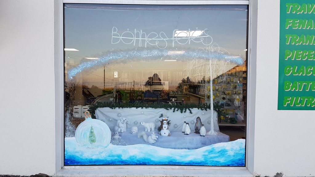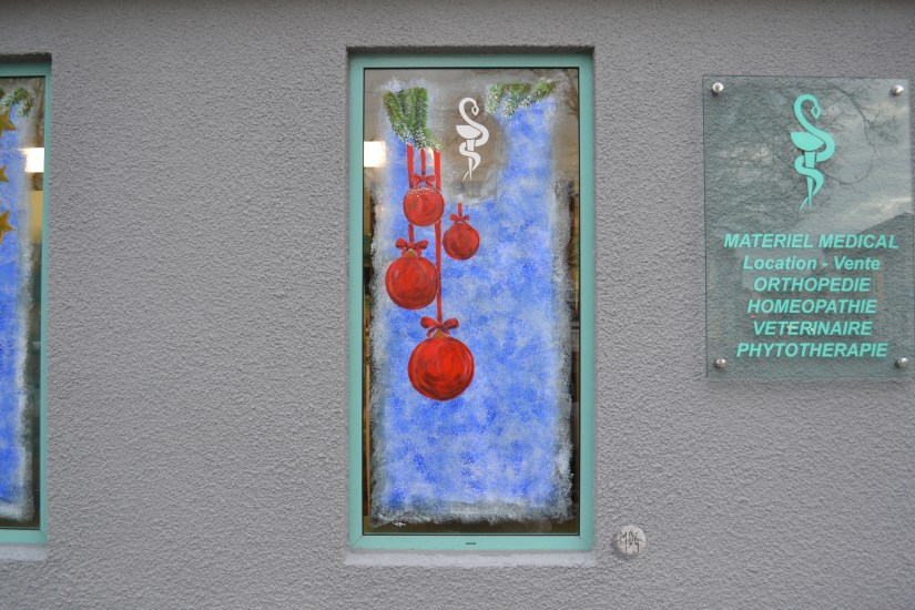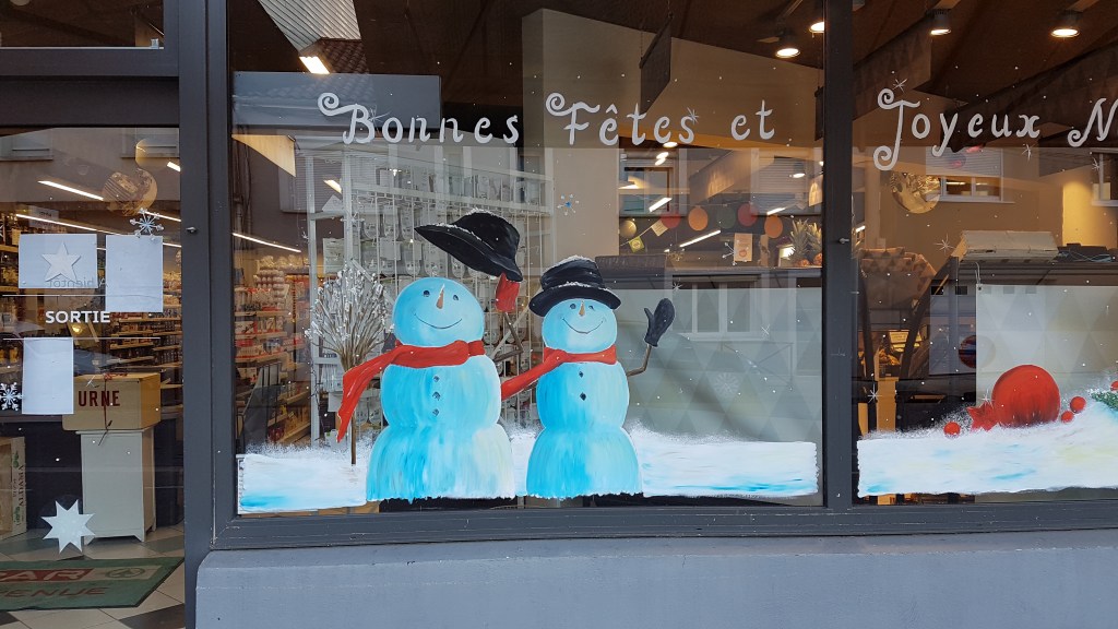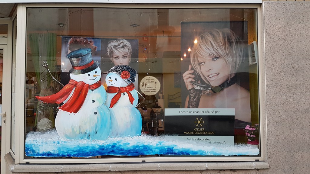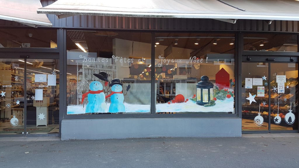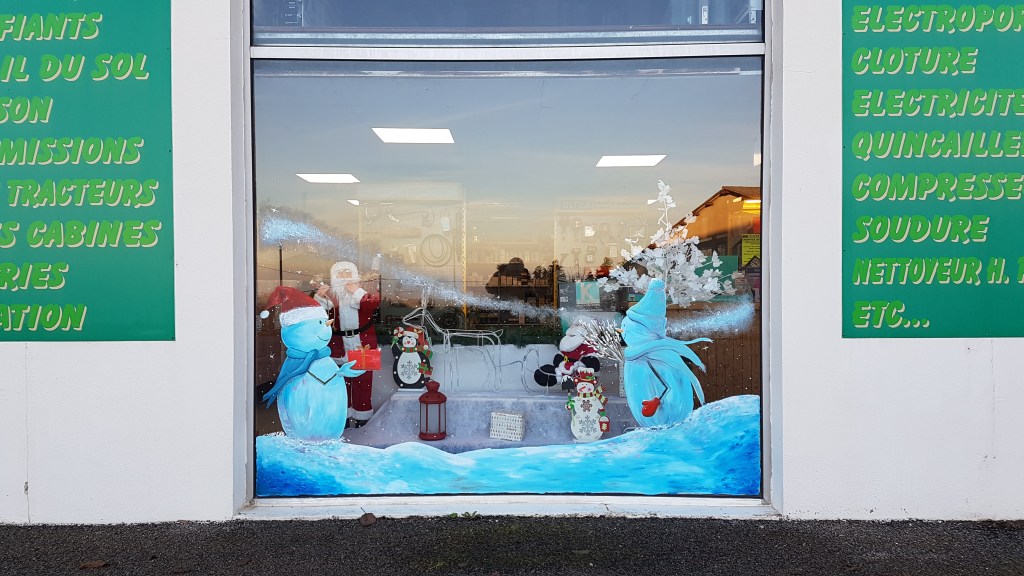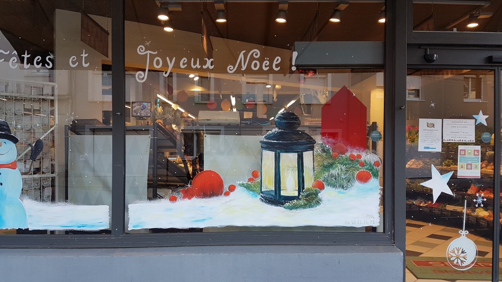 Je propose aux commerçants de peindre des tous sortes de thèmes et toute l’année sur les vitrines.